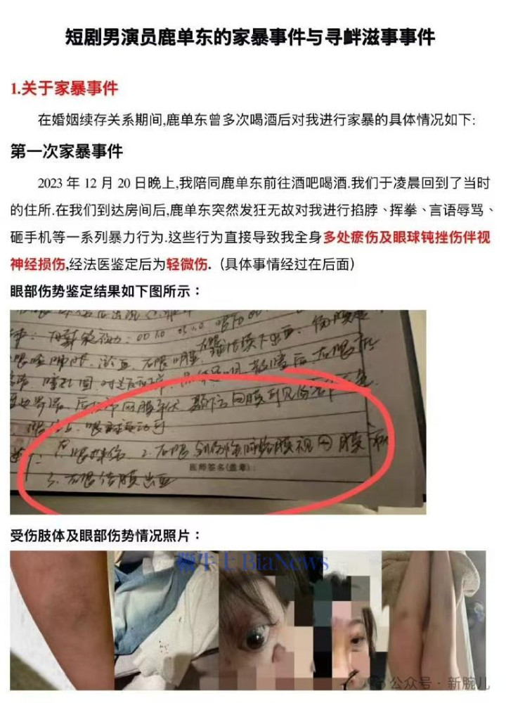 在爆料长文中,该网友默示在与鹿单东领证后的第六天,其对新婚妻子家暴,“鹿单东短暂发狂无故对我进行掐脖、挥拳、谈话吵嘴、砸手机等一系列暴力四肢,这些四肢平直导致我全身多处淤伤及眼球钝挫伤伴视神经损害”。