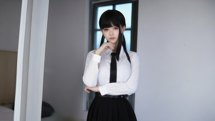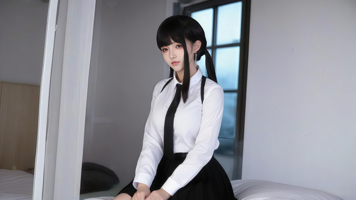 最后一张,她坐在床边,双马尾依旧,耳饰在光线下若隐若现。白衬衫、黑领带、黑百褶裙,双手交叠放在腿上,目光直视镜头。