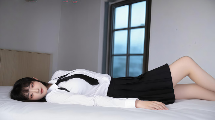 第三张,她趴在白色的床单上,开云app身体微微侧向一边,脸上带着淡淡的笑。还是那套白衬衫、黑领带、黑色百褶短裙,头发散落在枕头上,显得柔软又自然。