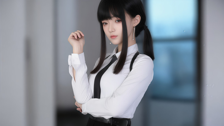 第一张,她在室内站着,白色衬衫、黑色吊带和领带、黑色高腰裙,腰间一条细细的皮带让整体更利落。双马尾、齐刘海,左耳的银色耳坠在光线下很安静地闪着。