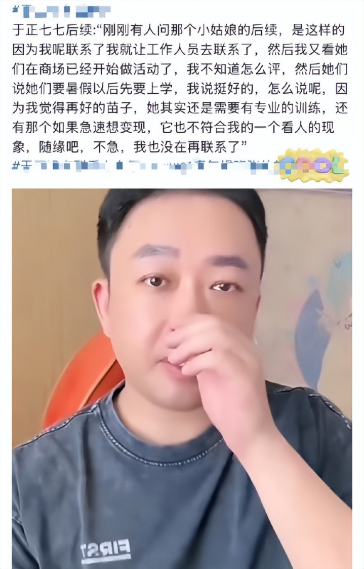 2025年夏天,七七的走红堪称一场“素人神话”。于正最初曾积极联系,流露出签约意向。然而,合作在短短数日内迅速破裂。于正在直播中坦言放弃,核心原因是他发现女孩的家人一方面以“学业优先”为由婉拒专业培训,另一方面却已带着她在家乡商场频繁接洽商业活动,走上了急速变现的道路。在于正的造星逻辑里,“再好的苗子也需要专业系统的训练”,而未经雕琢就急于消费颜值红利,是对天赋的透支,也背离了他“三年系统训练再出道”的长期培养模式。他的拒签,是一次基于行业标准的、冷静甚至略显冷酷的切割。