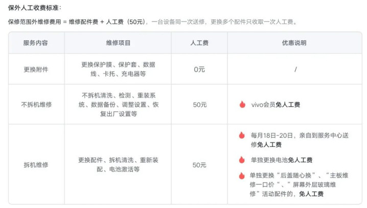 与此同时,不拆机维修,vivo会员免人工费;拆机维修,每月18-20日亲自到服务中心送修免人工费、单独更换电池免人工费;单独更换“后盖随心换”、“主板维修一口价”、“屏幕外层玻璃维修”活动配件,免人工费。