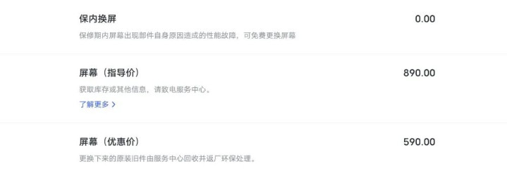 屏幕:指导价890 元,优惠价590 元(更换下来的原装旧件由服务中心回收并返厂环保处理)。