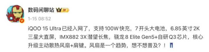 参考博主@数码闲聊站 的爆料来看,iQOO 15 Ultra支持100W快充,配备7开头大电池,采用6.85英寸2K三星大直屏。