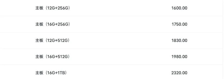 主板(12G+256G)1600 元、主板(16G+256G)1750 元、主板(12G+512G)1830 元、主板(16G+512G)1980 元、主板(16G+1TB)2320 元。