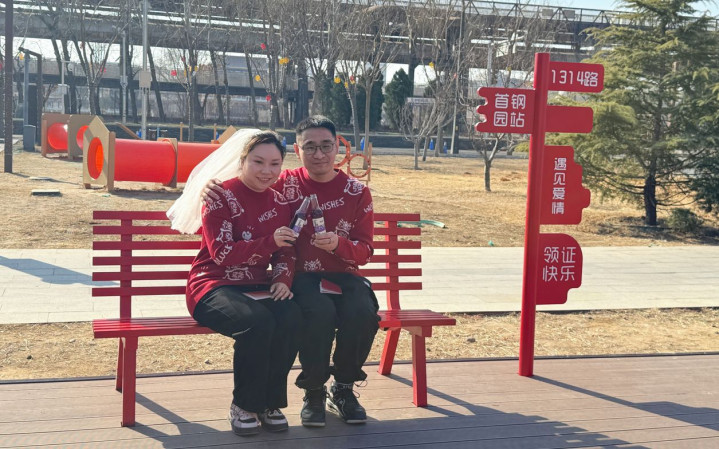 领完证后,王女士和牛先生在首钢园内合影眷顾。新京报记者 王景曦 摄