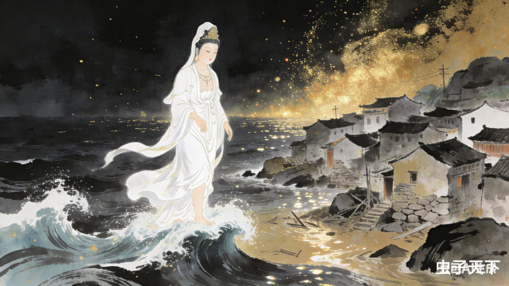 就在大家以为活不下去的时候,一天夜里,村口的海面上忽然亮起了金光,一个穿着白衣的女人踏浪而来,她就是观音。