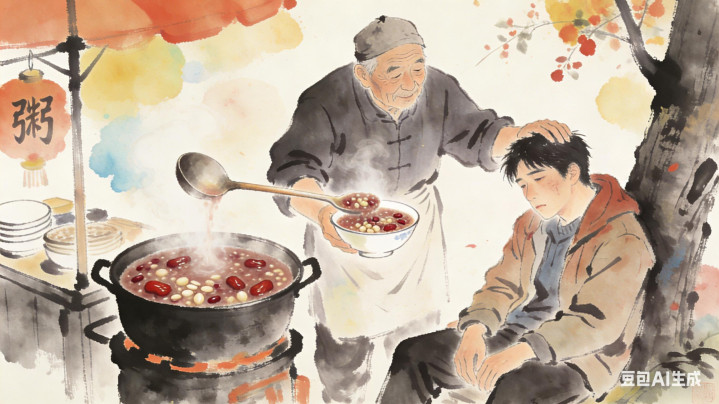 腊八那天,小石头捧着一碗自家煮的糙米粥,跟老周说:“周老师,等我将来有出息了,每年腊八都给您送热粥。”