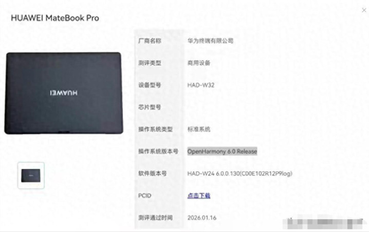 MateBook Pro 通过 OpenHarmony 6.0 认证。