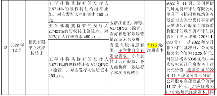 2022年12月,福恩股份曾引入外部投资者。当时,王学林将其所持公司部分出资额分别转让给浙江正凯、陈琼、XUQING(徐青),对应当时的股权比例为2.5714%、2.7429%、2.5714%,代价为7.115元/注册资本,仅略高于剔除分红后的评估价格6.44元/注册资本。