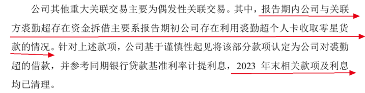 但在报告期内,裘勤超曾使用个人卡为公司收取零星货款,并被认定为公司提供的借款。于2022年末,这笔借款余额约126万元,在2023年偿还完本息。