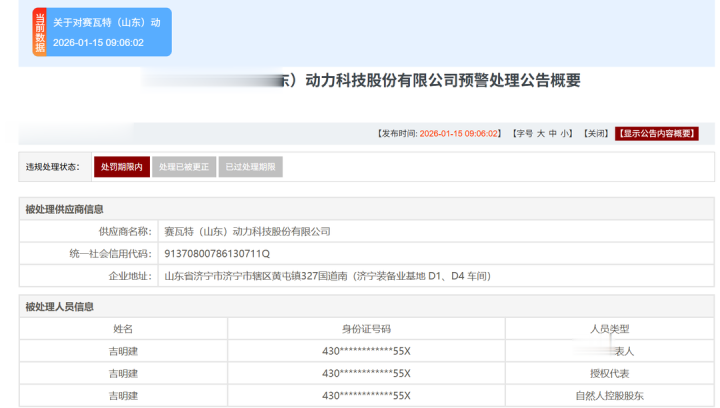 据军队采购网信息,赛瓦特(山东)动力科技股份有限公司(下称“赛瓦特”)被列入军队采购预警名单,预警时间为2026年1月15日,组织形式为集中采购,具体预警情形为给部队人员送现金、请托为该公司经费结算提供帮助。该预警同时涉及赛瓦特法定代表人、授权代表、自然人控股股东吉明建。