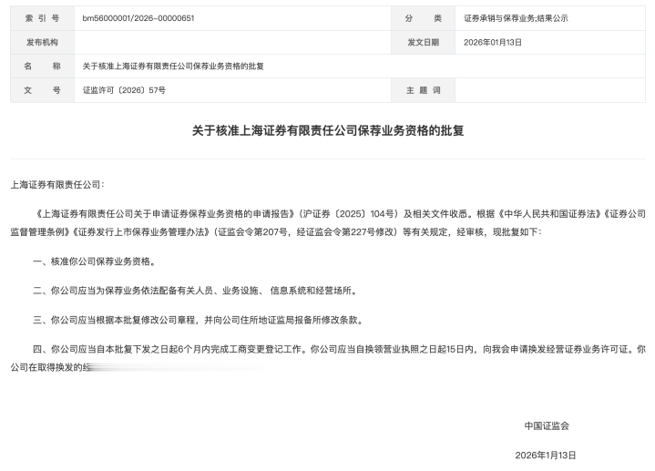 财联社1月17日讯(记者王晨)1月13日,中国证监会正式核准上海证券保荐业务资格,这家深耕上海、辐射长三角的区域券商,在投行业务上实现了关键扩容。