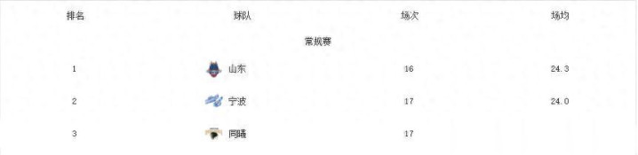 场均犯规数前三名是山东男篮(24.3次)、宁波男篮(24次)、同曦男篮(23.1次)