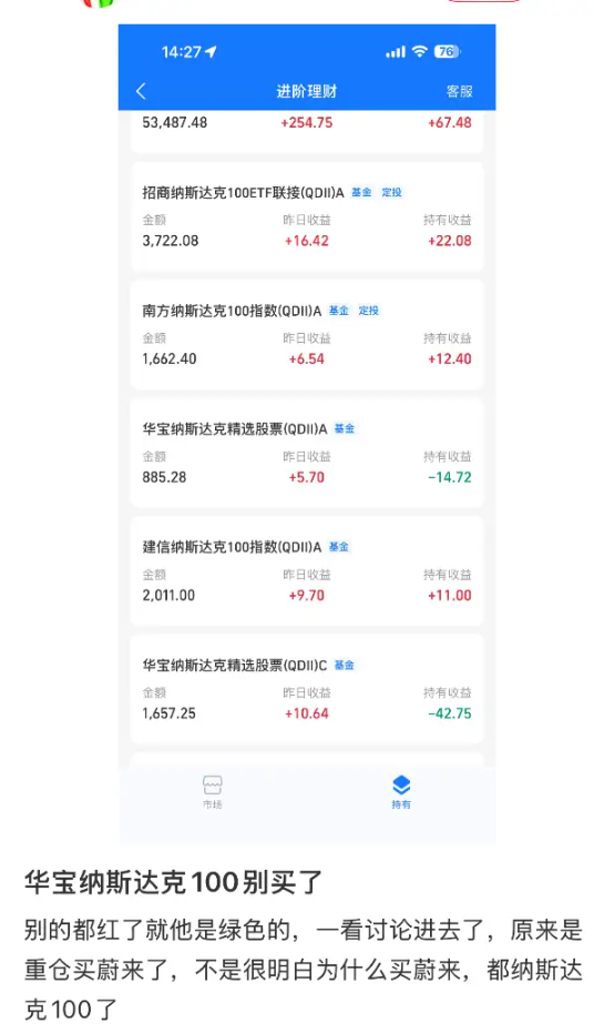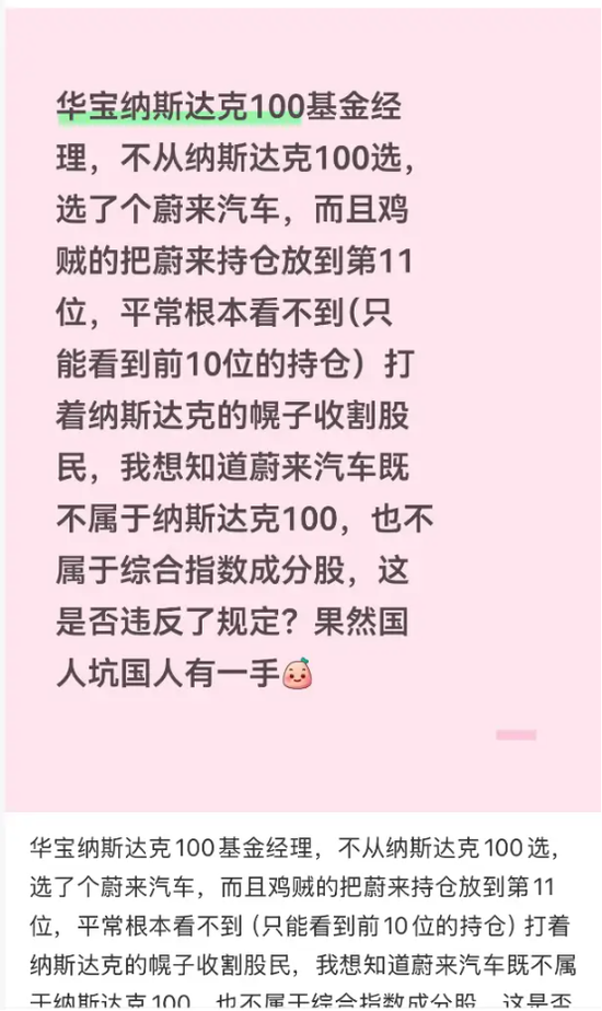 一位基民表示,华宝纳斯达克100基金经理,不从纳斯达克100选,选了个蔚来汽车,而且鸡贼的放在第11大持仓。