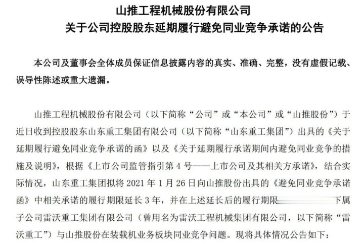 1月12日晚间,山推股份(SZ000680,股价12.51元,市值187.67亿元)公告称,公司控股股东山东重工集团有限公司(以下简称“山东重工”)拟将2021年1月26日向山推股份出具的《避免同业竞争承诺函》中相关承诺的履行期限延长3年,并在上述延长后的履行期限内妥善解决其下属子公司雷沃重工集团有限公司(以下简称“雷沃重工”)与山推股份在装载机业务板块同业竞争问题。