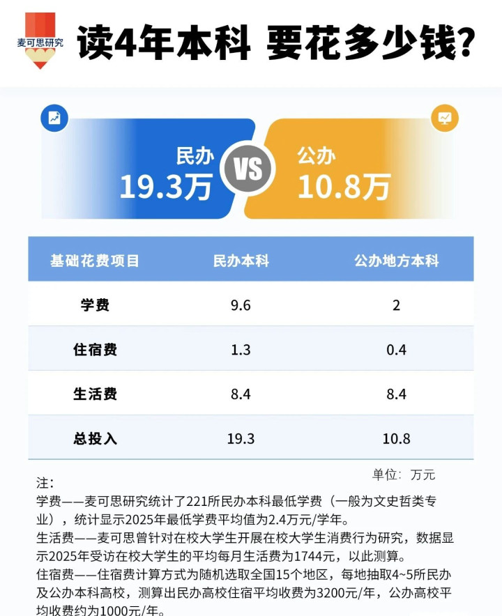 第一,民办本科四年总投入高达19.3万元,是公办地方本科(10.8万元)的近两倍;