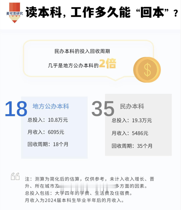 第三,从简化测算来看,民办本科毕业生回本周期要35个月(近3年),而公办地方本科只要18个月(1年半);