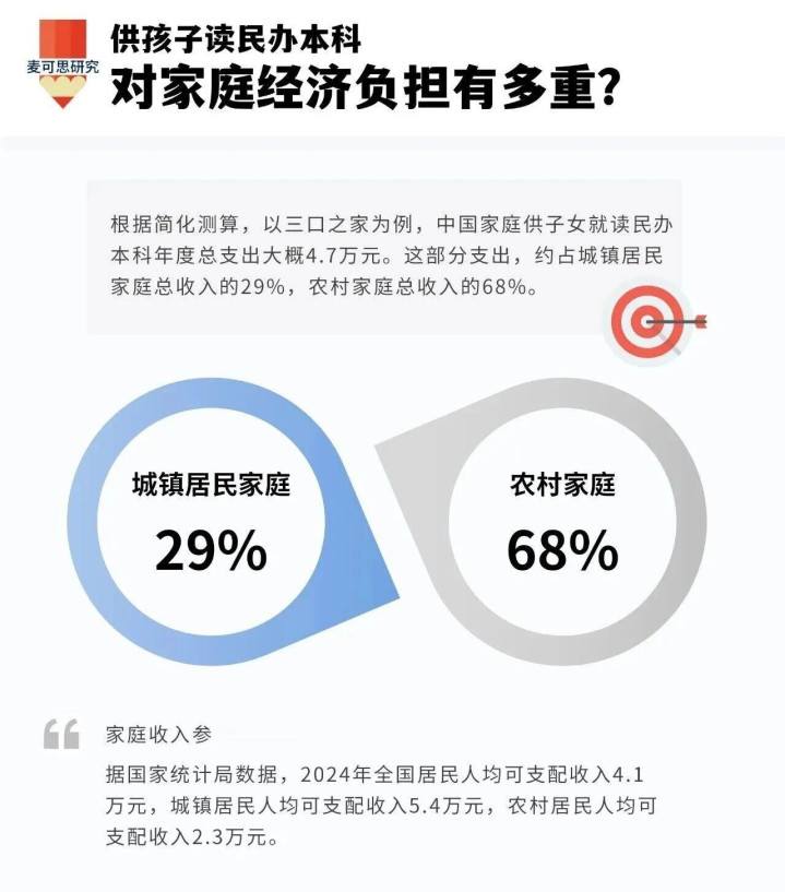 根据国家统计局2024年的数据,全国城镇居民人均可支配收入5.4万元,三口之家一年总收入大概16.2万元,民办本科四年19.3万的投入,要占家庭总收入的29%;