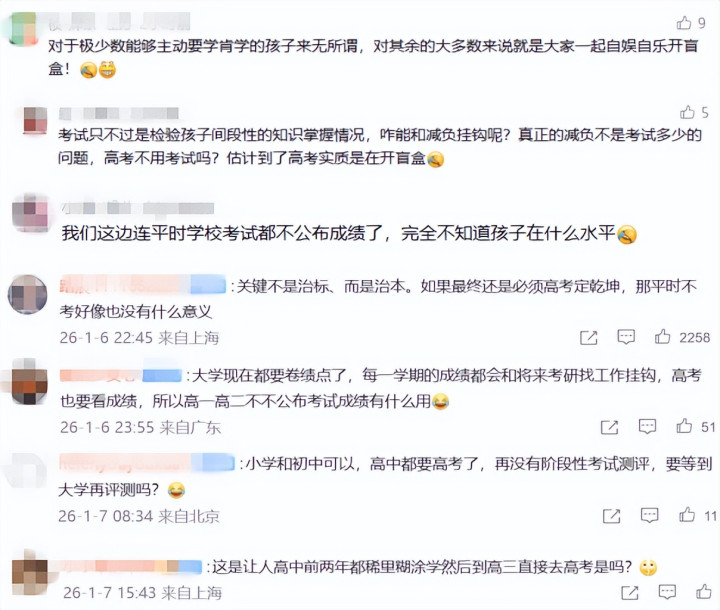 因此,个人观点,考试次数应该管控,可以压减,但得管控到关键处。取消统考特别是高一、高二的统考,可能不见得那么急迫,倒是月考之类的可以控制一下。