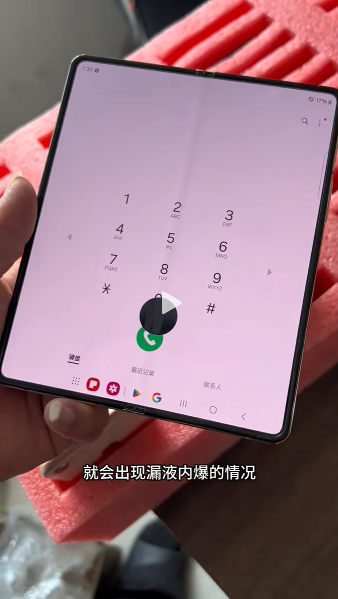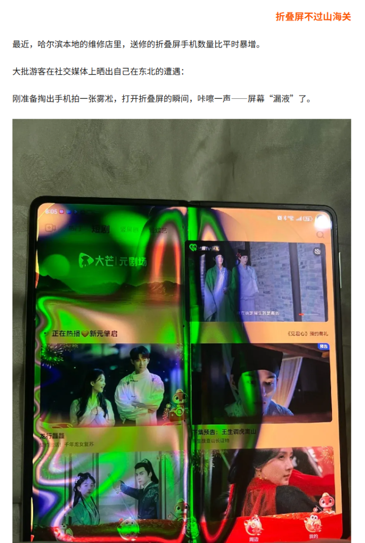 目前折叠屏的主要问题还正是折痕问题,最近也刷到不少手机维修店主爆出的折叠屏漏液情况,还有像是去东北玩折叠屏容易冻坏,严重的甚至会爆屏,折痕控制不好都有可能会导致这些问题,因此对折叠屏的铰链、屏幕考验极大。