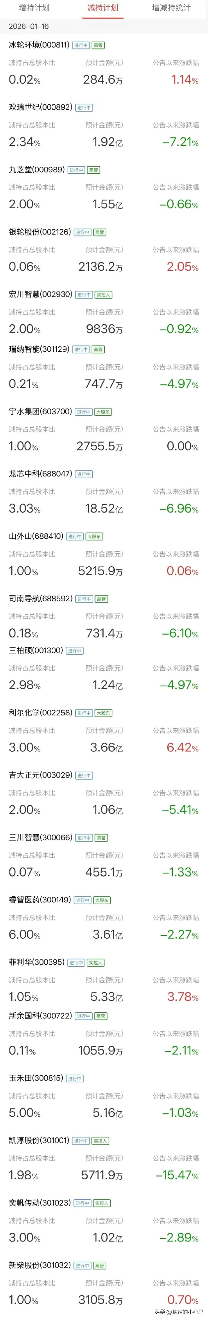 除了这几家,1月15日晚间发布减持公告的还有冰轮环境、欢瑞世纪、九芝堂、银轮股份等一众公司。这些公司虽然行业不同、涨幅各异,但有个共同点,要么是股价近期大幅上涨,要么是基本面一般却被炒到高位,股东此时减持,本质上是对当前股价的不认可。