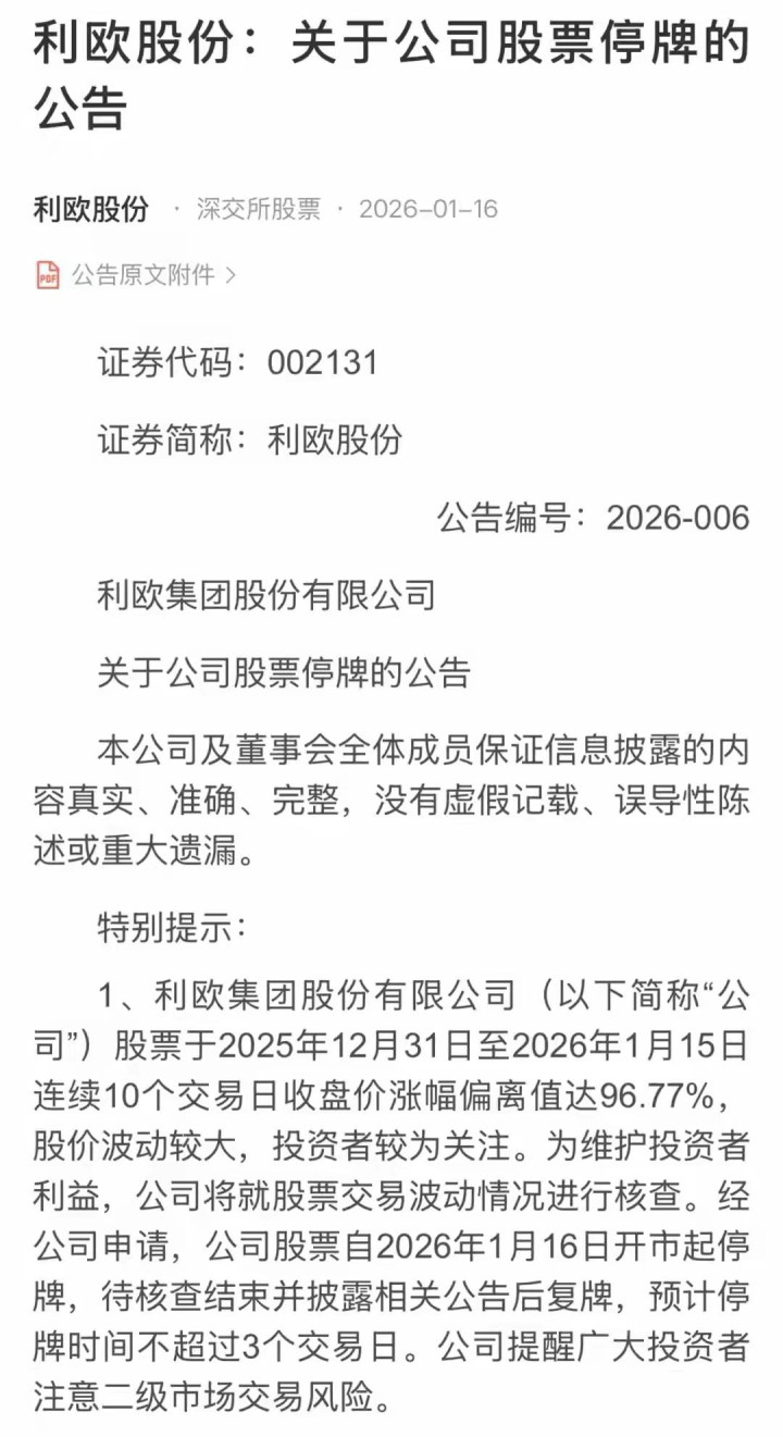 再看停牌核查的情况,1月15日晚间利欧股份公告停牌核查,停牌时间为三个交易日。这只股近期的涨幅确实惊人,年内上涨接近7倍,光近半个月就从5元涨到了10.40元,还创下了历史新高。但诡异的是,公司年报还是亏损状态,股价明显偏离估值,监管层出手停牌核查,也是为了保护投资者利益,避免大家盲目追高。