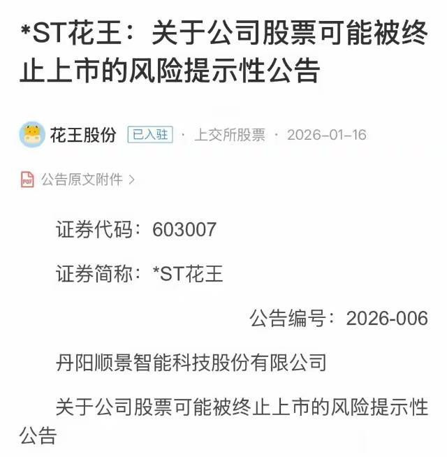 先说说退市风险这颗“雷”,近期已有多家公司亮起红灯。ST花王1月15日晚间发布可能终止上市的风险提示公告,这家公司已经连续5年亏损,去年营业总收入还不足2亿元,净利润和扣非净利润都是负数。虽然之前完成了股权变更,但基本面没得到实质改善,按照2026年退市新规,大概率要被市场出清。