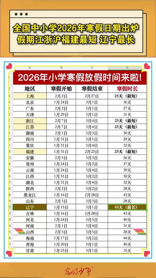 2026年中小学寒假时间表正式出炉,各地假期时长的巨大差距让无数家长坐不住了!江浙沪+福建的寒假仅25天,直接跻身全国最短阵营,而北京义务教育阶段寒假长达37天,两地相差近两周。这看似简单的天数差异,背后藏着的不仅是气候与传统的影响,更是教育节奏与育人理念的深层分歧。