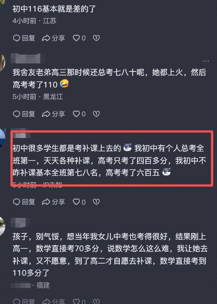 有个妈妈在朋友圈发女儿的成绩,高一数学考了46分,是全班倒数第一,她自己都愣住了,因为初中时这孩子的数学一直保持在116分左右,老师都说她是学习很好的学生,结果一进高中就落后了,她先想到责怪老师、怀疑女儿早恋,却没想到可能是过去三年补课太多害了孩子。