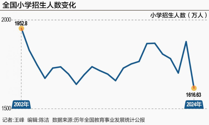 这一结论也得到最新发布的《中国统计年鉴2025》的印证,2024年,全国小学招生人数为1616.6万人,减少261.3万人;在校学生从1.08亿减少到1.05亿,下降252万人。