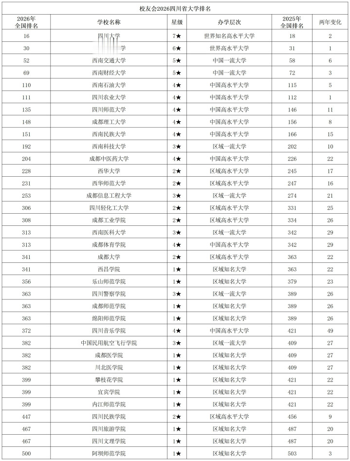 校友会发布了2026年中国大学排行榜,有4所在川高校进入全国前100强,其中四川大学位于全国第16位、电子科技大学位于全国第30位、西南交通大学位于第52位、西南财经大学位于第69位。另有6所高校进入全国前200名,分别是西南石油大学(第110位)、四川农业大学(第111位)、四川师范大学(第135位)、成都理工大学(第148位)、西南民族大学(第151位)、西南科技大学(第192位)。四川省属高校排名最高的是西南石油大学。
