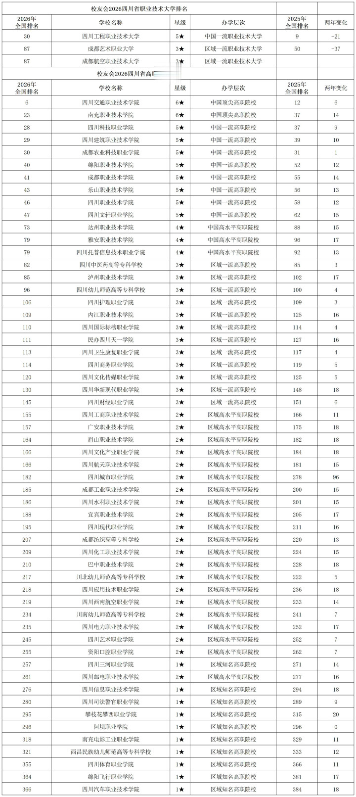 2026年校友会职业四川职业技术大学排名最高的是四川工程职业技术大学,排名全国第30位,比去年降低了21位。