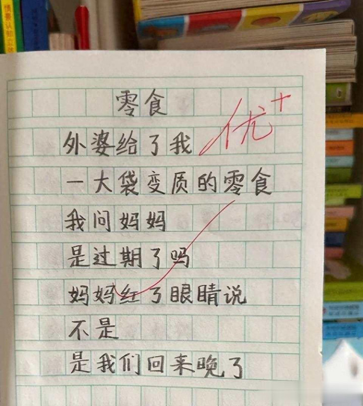 有些老师让学生写作文必须充满正能量,结尾还要提升一下境界,孩子们就只能编造故事,写出妈妈多么温柔、爸爸多么贴心的情况,其实最能打动人心的往往是那些不够完美的句子,比如有个孩子写到妈妈买零食的事情,妈妈说“不是零食过期了,是我们回来晚了”,这话听着很平常,但孩子心里明白,妈妈没有骗他,也没有硬撑着面子。